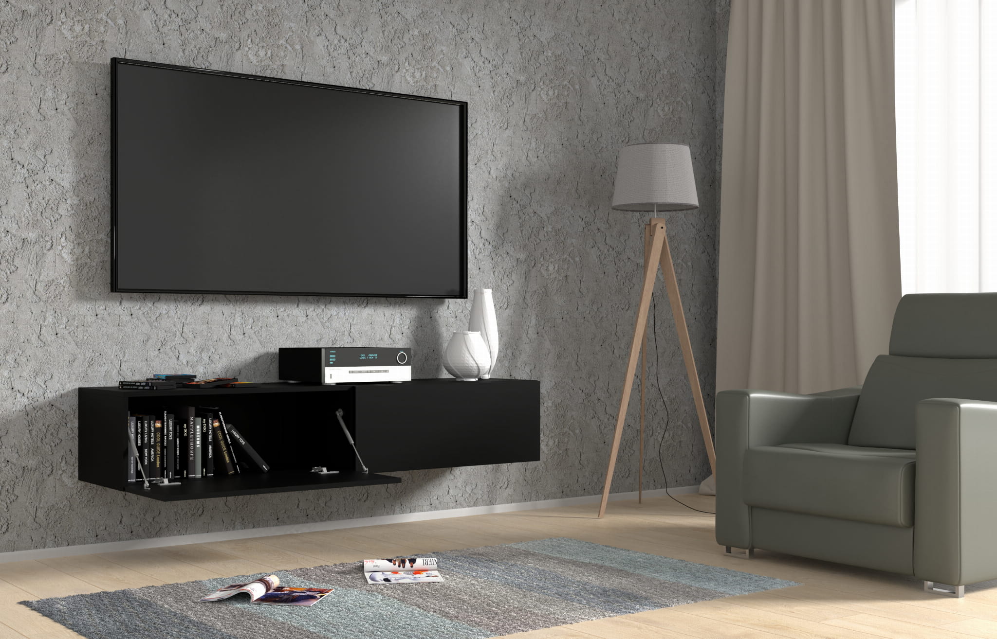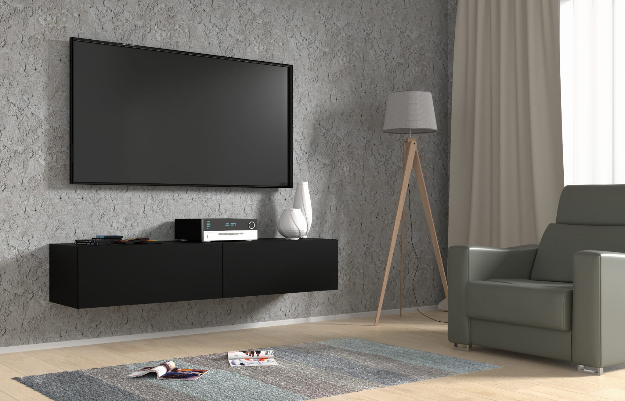 Szafka wisząca RTV 160 cm, do salonu, czarna matowa Bingo