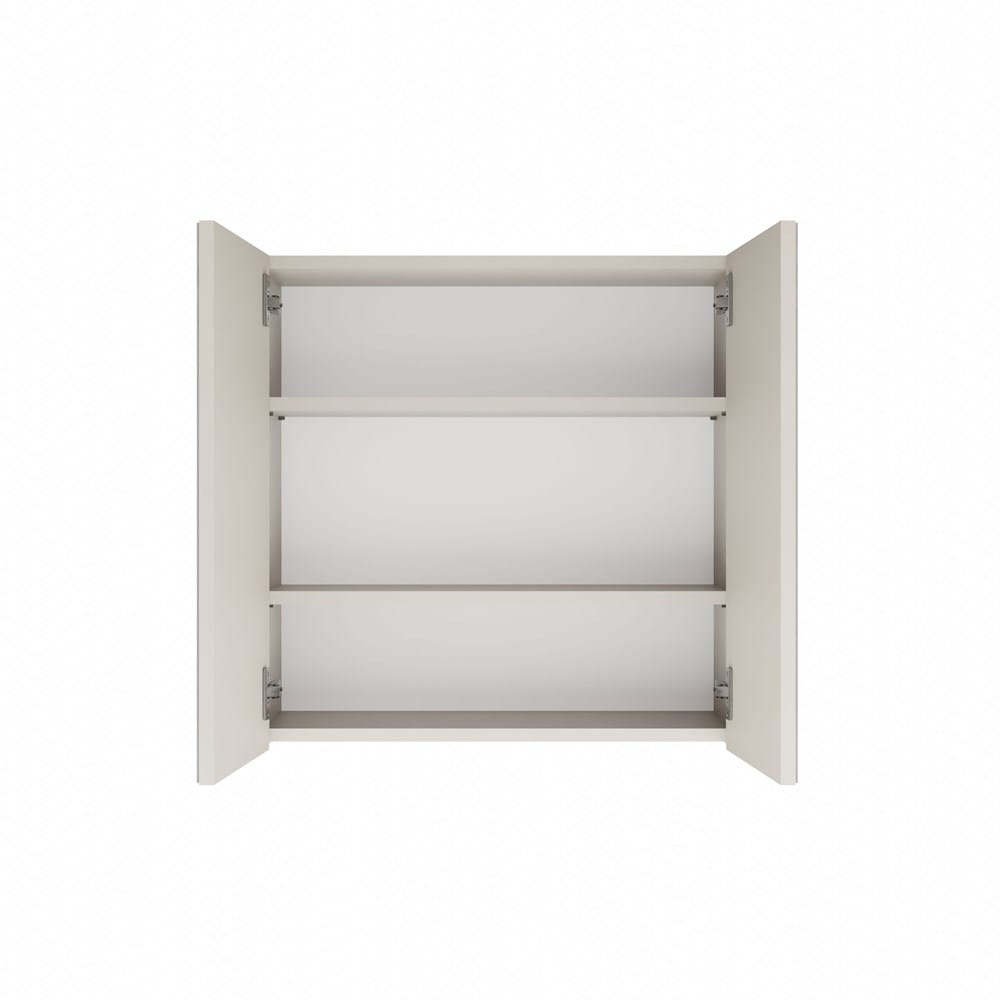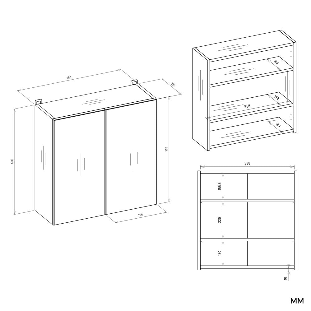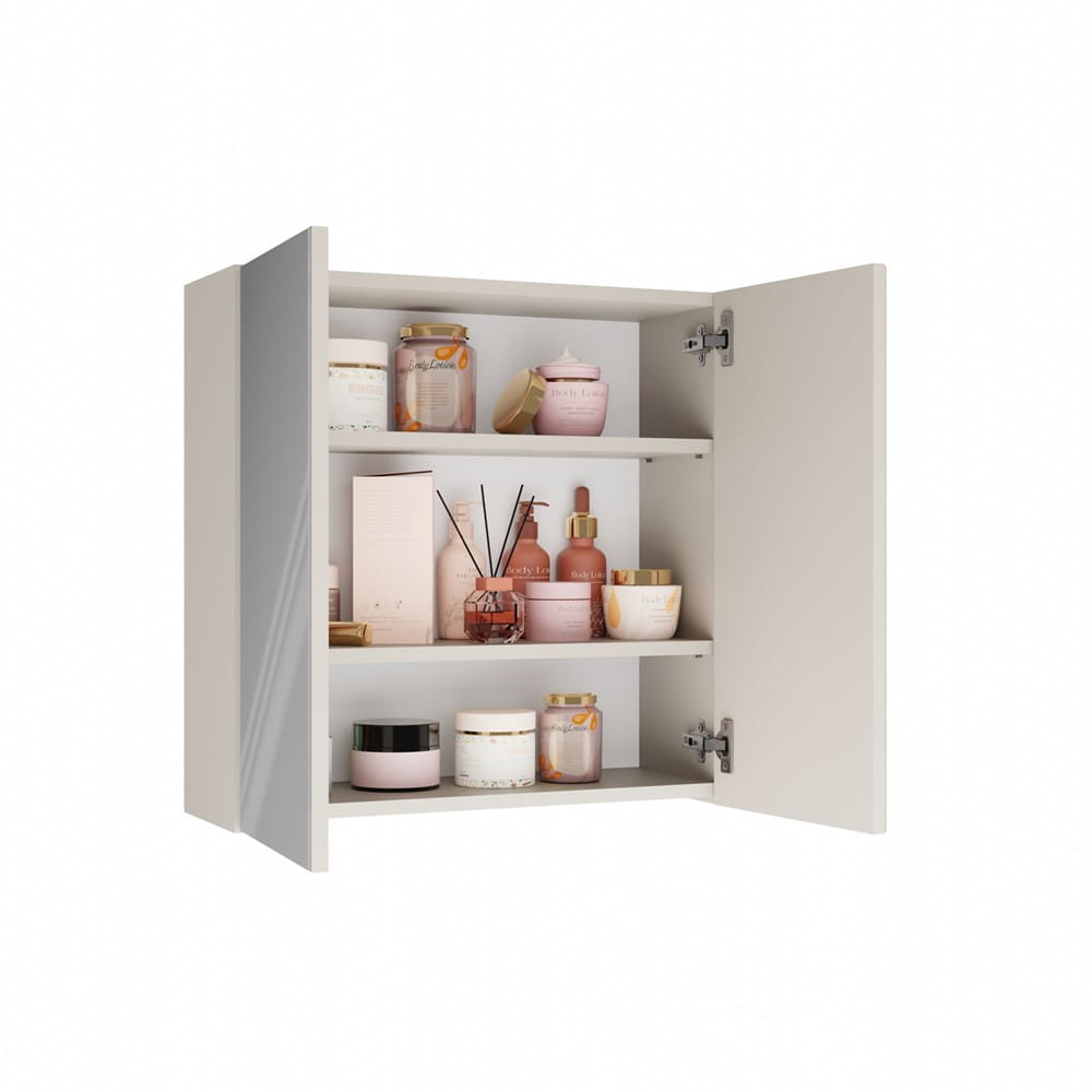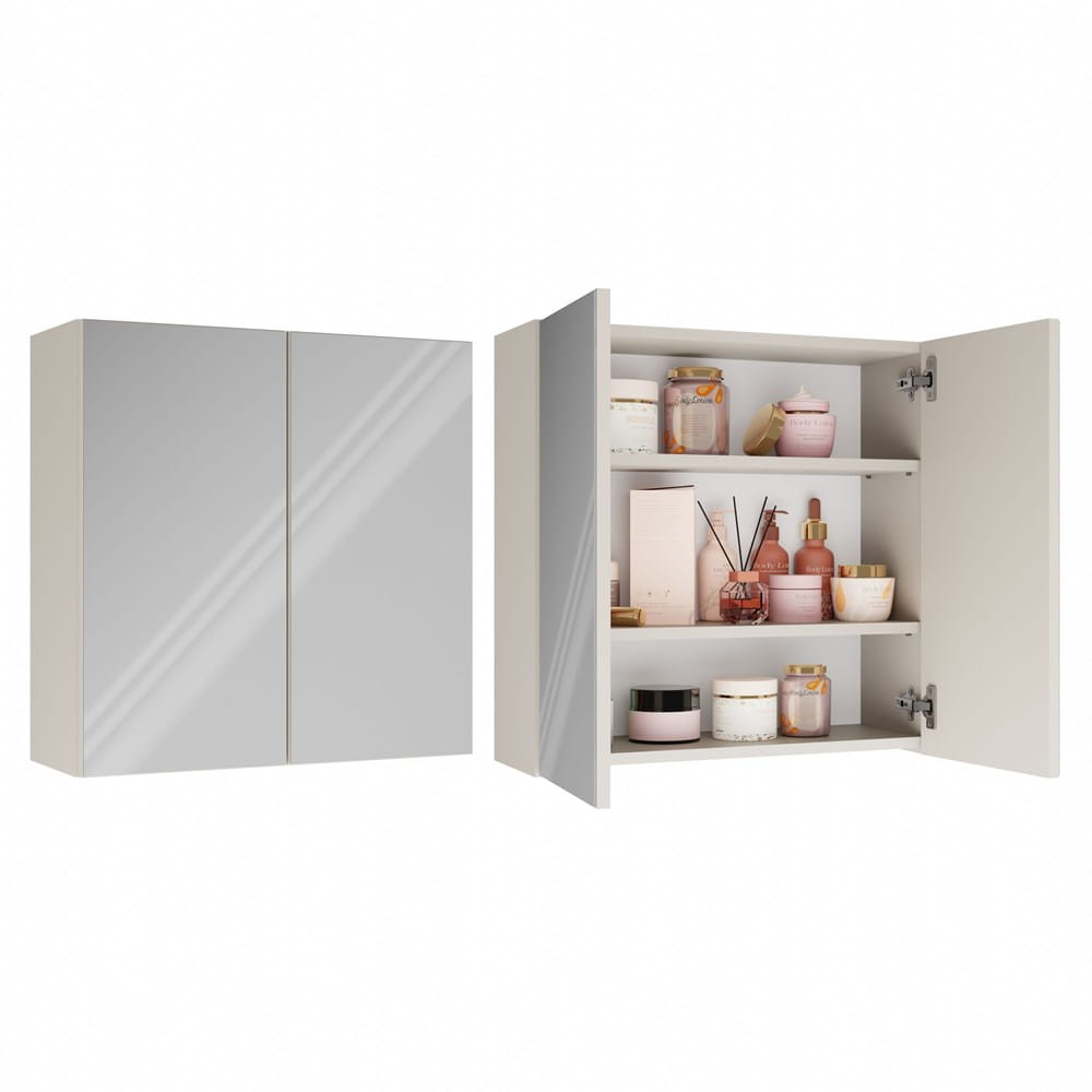 Model wyposażony jest w dwoje drzwiczek z lustrzanymi frontami, które pełnią nie tylko praktyczną funkcję, ale także optycznie powiększają przestrzeń. Wewnątrz znajdują się trzy pojemne półki, idealne do przechowywania kosmetyków, ręczników oraz innych akcesoriów łazienkowych.