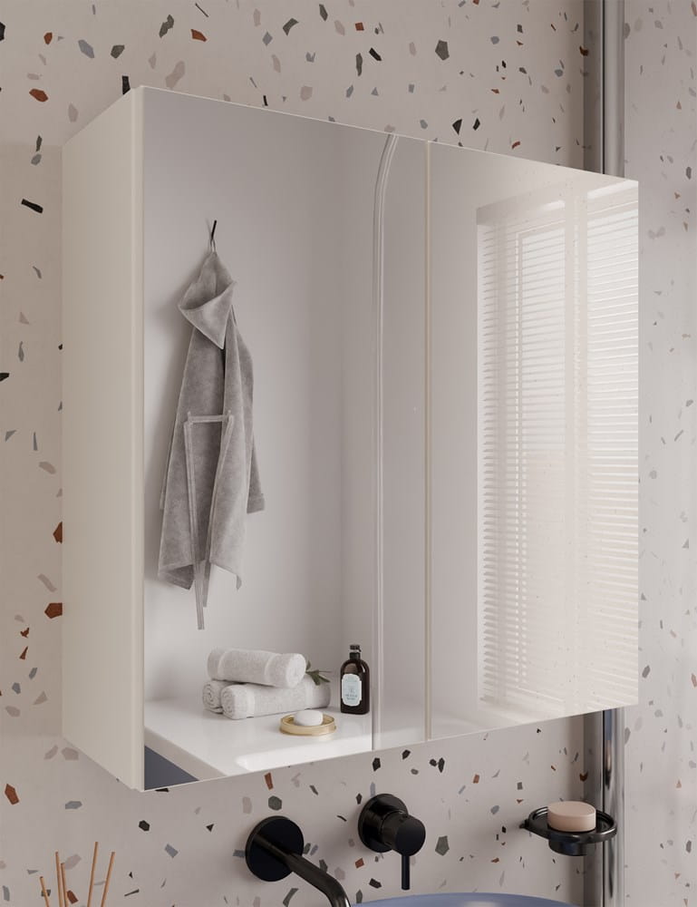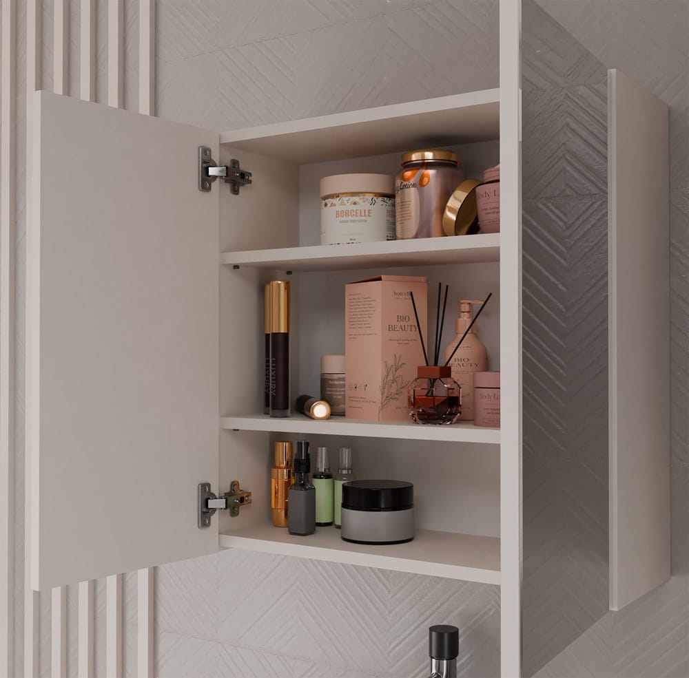 - 3 praktyczne półki – schowane za 2 drzwiczkami z lustrzanym frontem