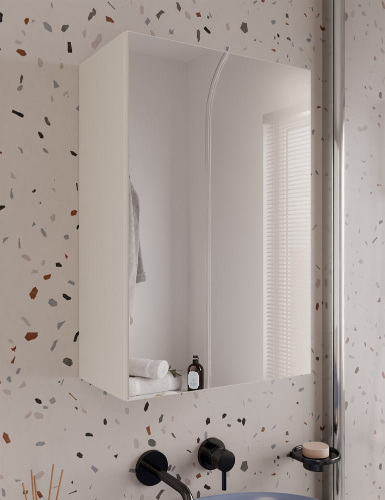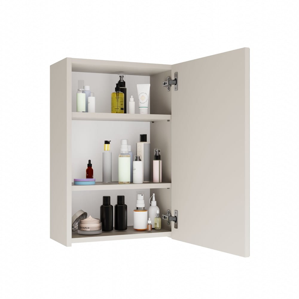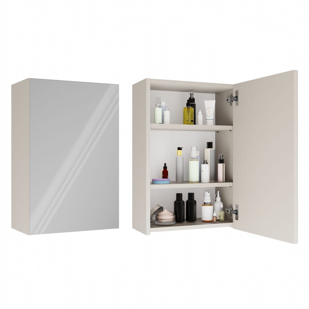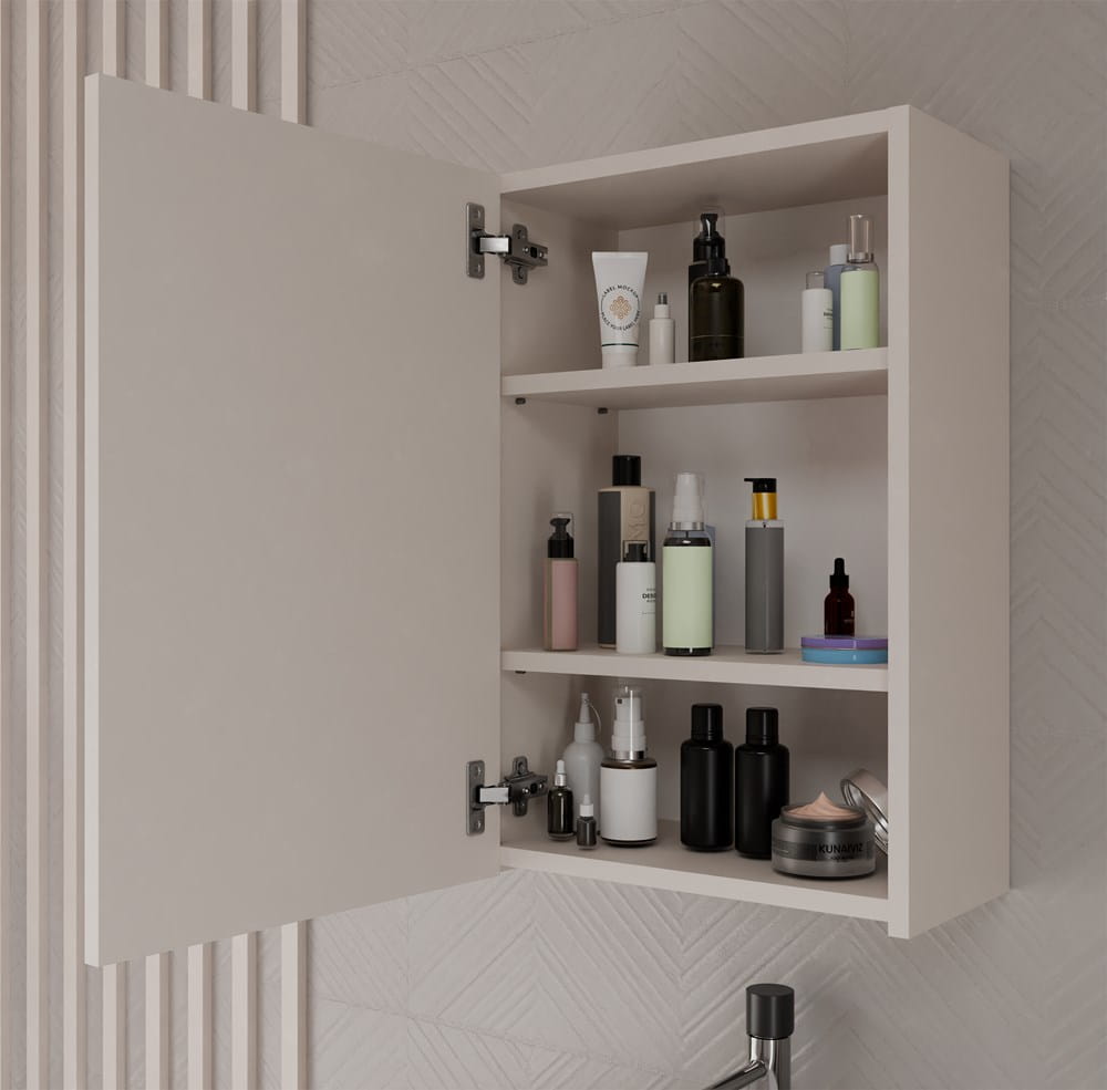 Model wyposażony jest w drzwiczki z lustrzanym frontem, które nie tylko optycznie powiększają przestrzeń, ale także pełnią praktyczną funkcję codziennego użytku. Wewnątrz znajdują się trzy pojemne półki, idealne na kosmetyki, ręczniki i akcesoria łazienkowe.