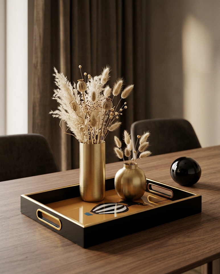 Kontrastujące kolory w połączeniu ze złotymi detalami uchwytów tworzą elegancki, nowoczesny akcent, który doskonale wpisuje się w aktualne trendy wnętrzarskie. Taca może pełnić funkcję praktyczną i ozdobną jednocześnie – sprawdzi się do serwowania, eksponowania świec, perfum, biżuterii lub innych dekoracji.