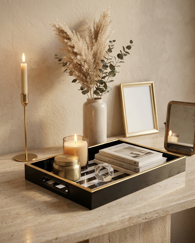 Lustrzana powierzchnia efektownie odbija światło, pięknie eksponując ustawione na niej świece, kosmetyki, dekoracje lub serwowane napoje.