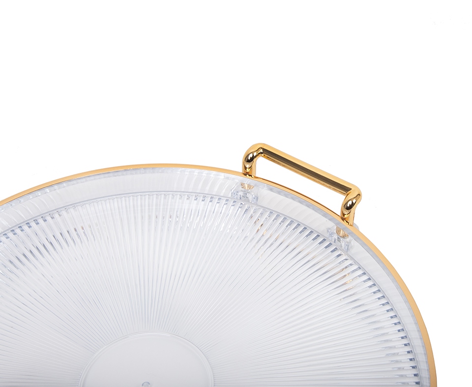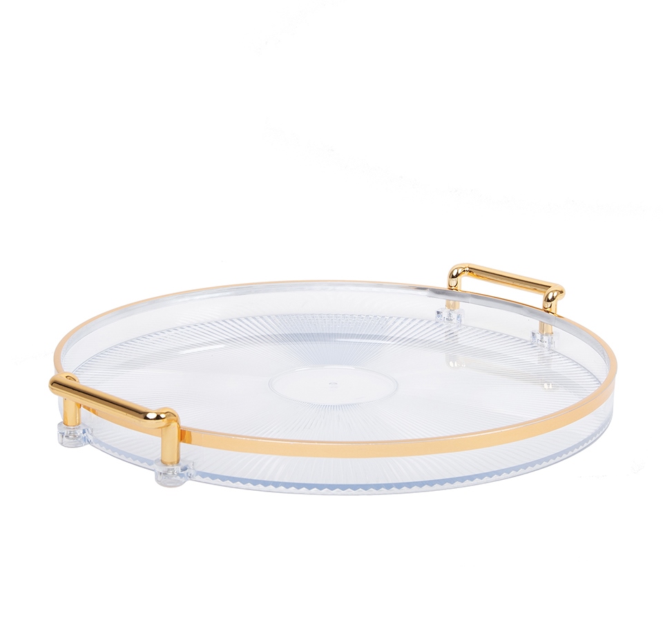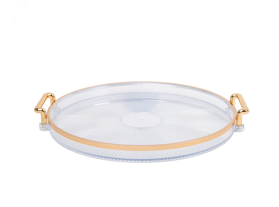 Taca dekoracyjna SHP LUXI to elegancki dodatek do wnętrza, który łączy transparentną lekkość akrylu ze szlachetnym, złotym wykończeniem.