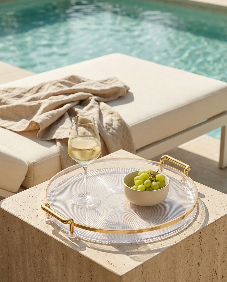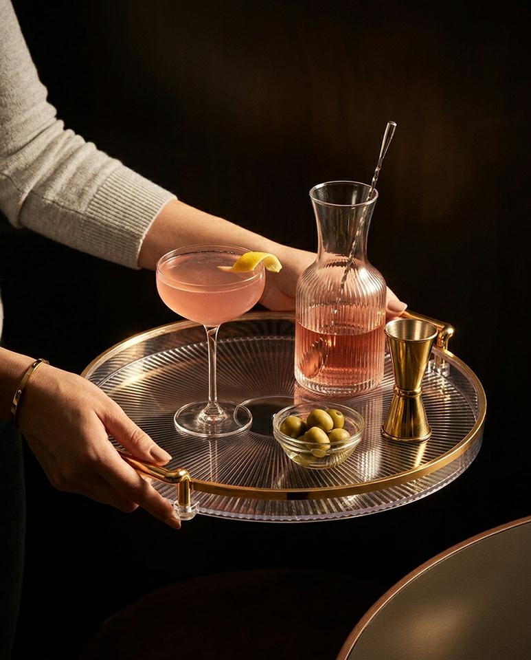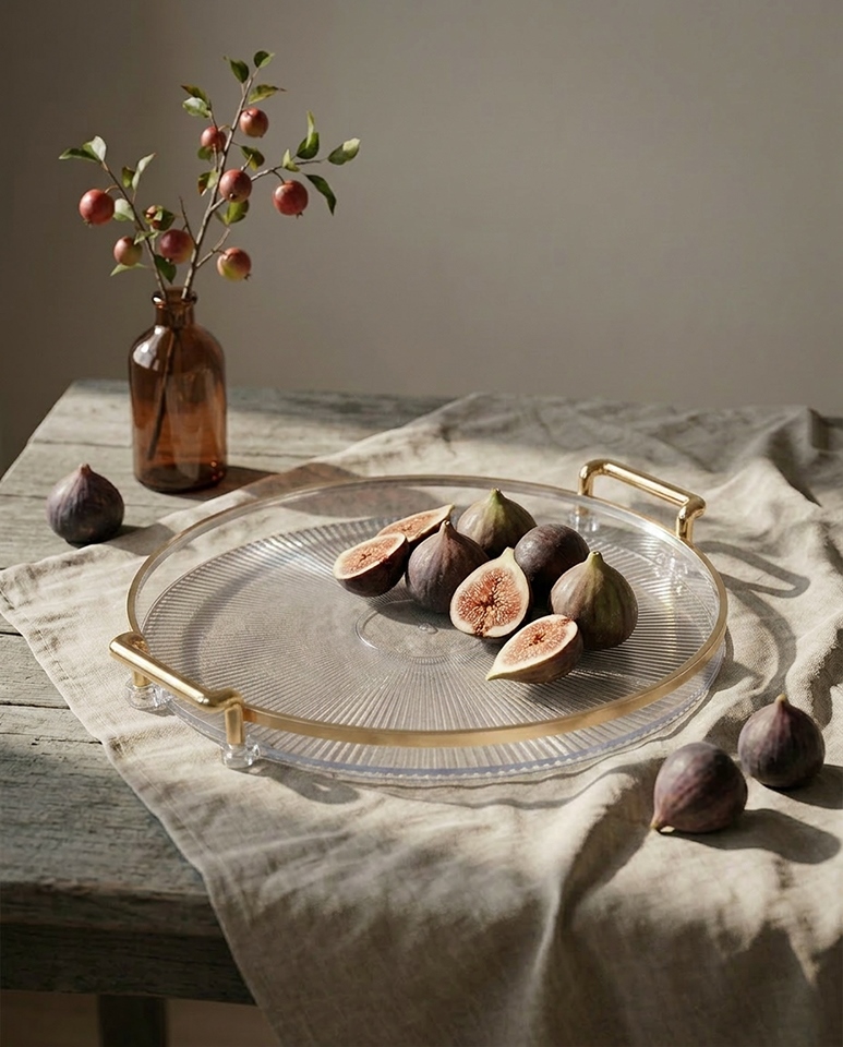 Przejrzysta forma z subtelną strukturą pięknie odbija światło, dzięki czemu taca wprowadza do aranżacji delikatny blask i efekt luksusowej dekoracji.