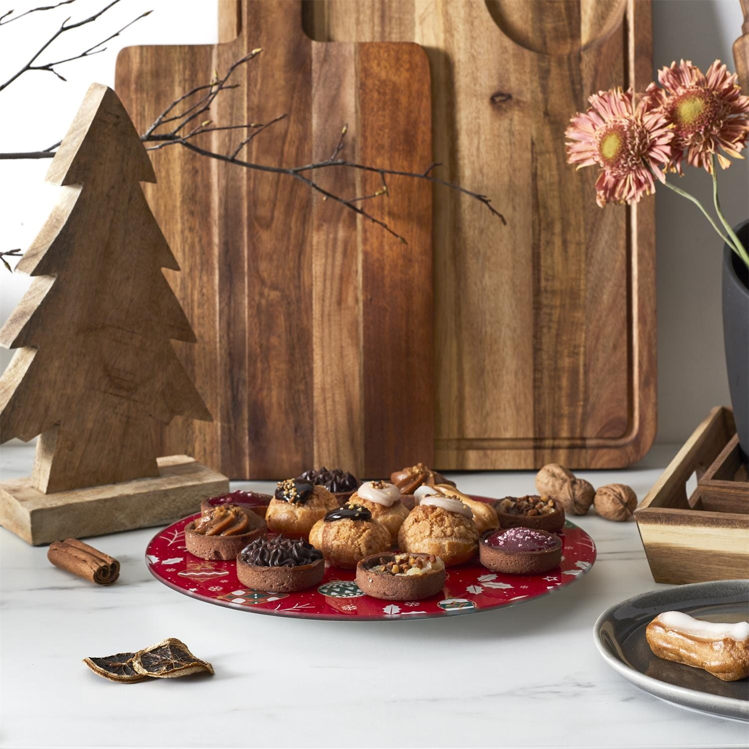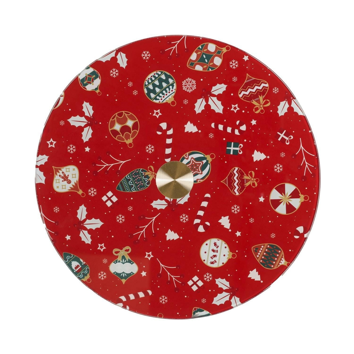 Obrotowa taca z motywem świątecznym to idealny sposób na eleganckie podanie świątecznych smakołyków. Dzięki obrotowej metalowej podstawie łatwo można sięgnąć po ulubione ciasteczka, pierniczki, praliny czy owoce – bez konieczności przestawiania tacy.