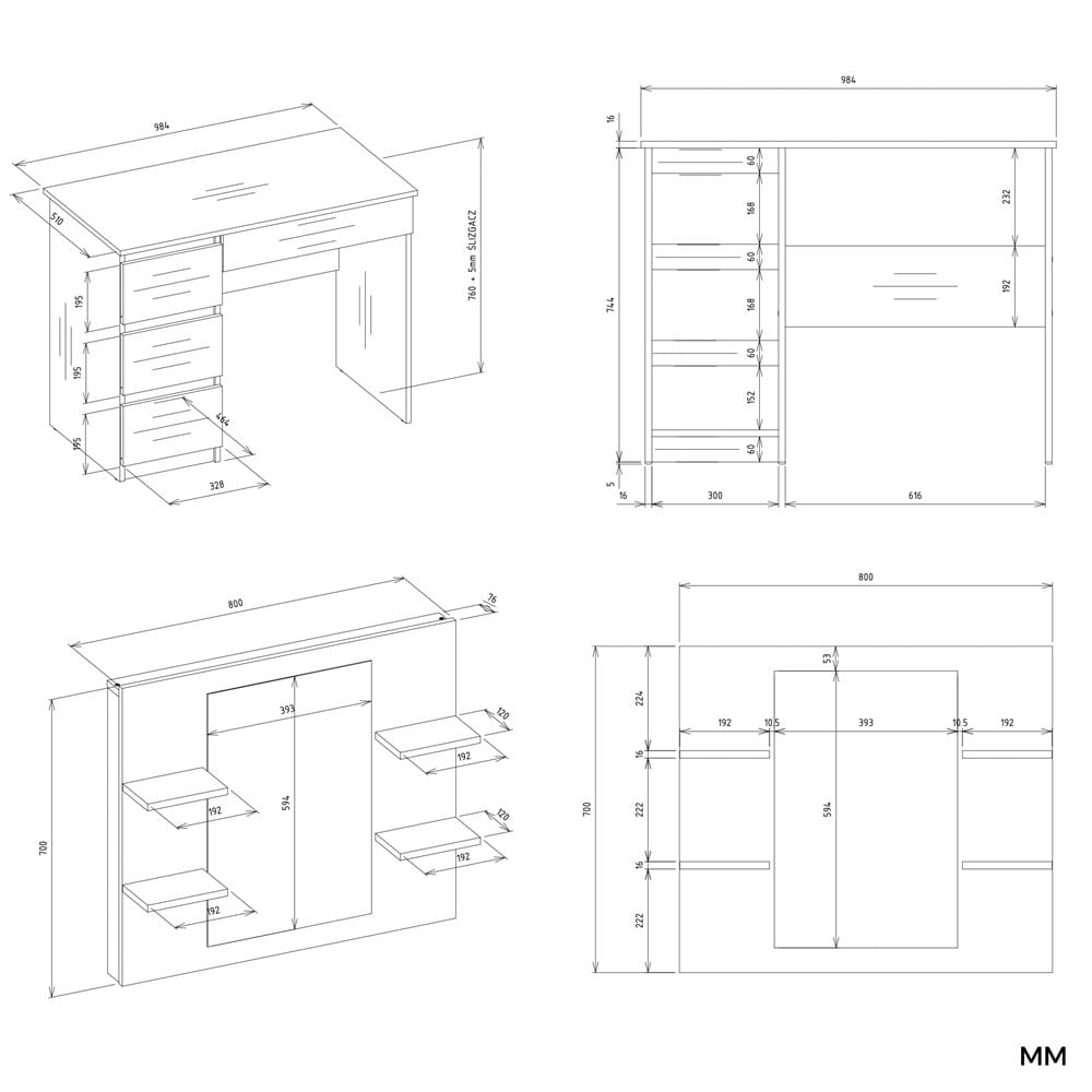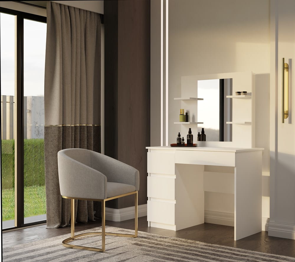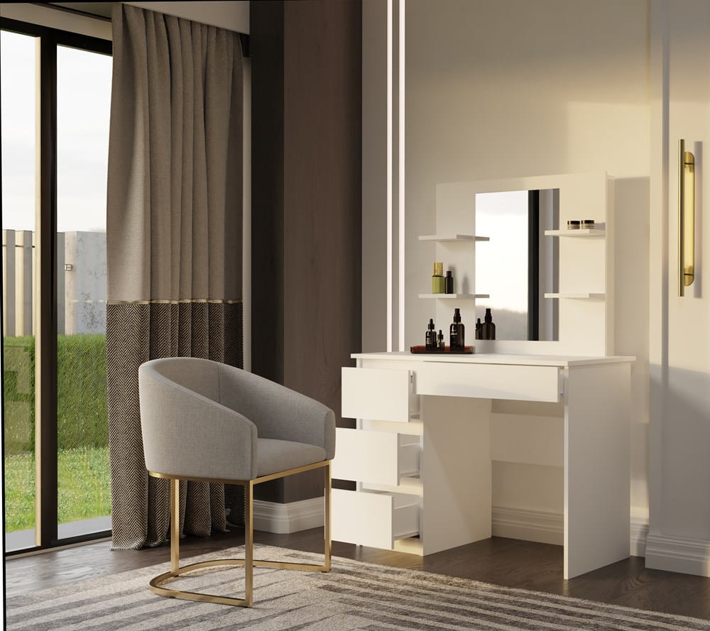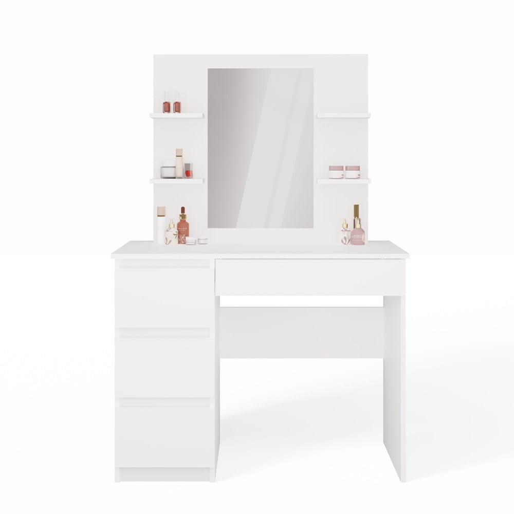 Duże wbudowane lustro oraz cztery praktyczne półki po bokach zapewniają wygodną przestrzeń do przechowywania kosmetyków, perfum, biżuterii i innych drobiazgów. Cztery pojemne szuflady – w tym jedna szeroka – oferują dodatkowe miejsce na akcesoria lub dokumenty, pomagając utrzymać porządek.