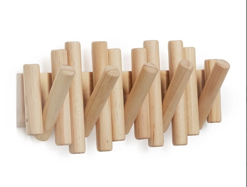 Inspiracją dla jego projektu jest prosty, geometryczny kształt wzbogacony o drewniane kołki z sosny, dzięki którym wieszak staje się ciekawym elementem aranżacji wnętrza.