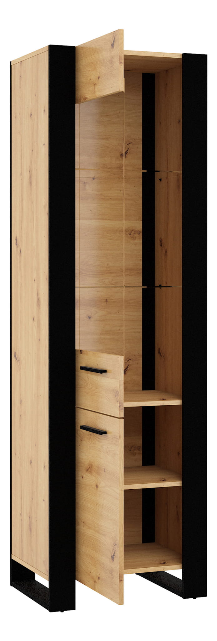 Przemyślany układ: Witryna podzielona na część przeszkloną i zakrytą, co pozwala na wyeksponowanie dekoracji, jednocześnie oferując przestrzeń do przechowywania rzeczy w sposób dyskretny.