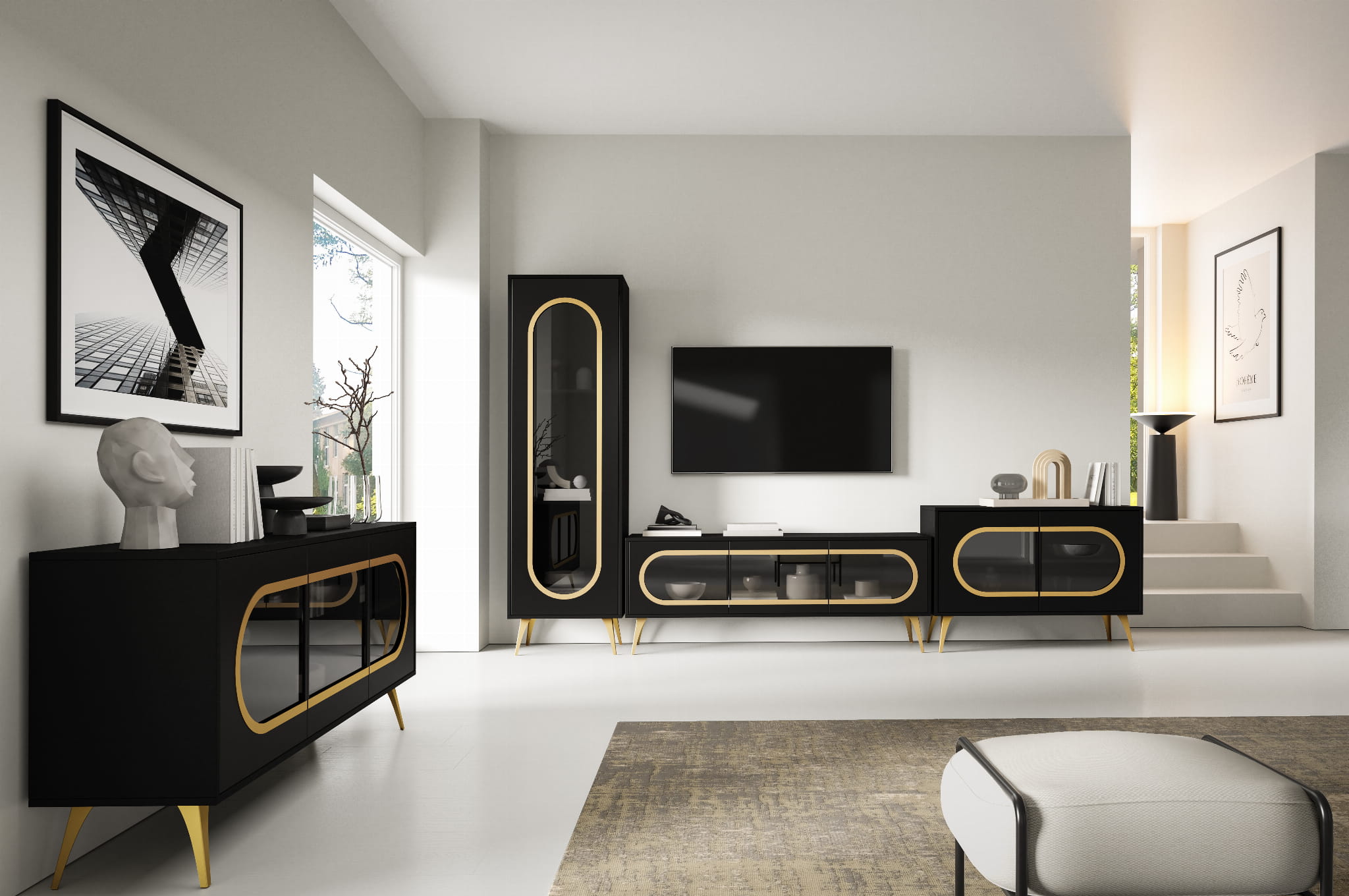 ✅ Smukłe, metalowe nogi w kolorze złota – podkreślają nowoczesny charakter witryny.