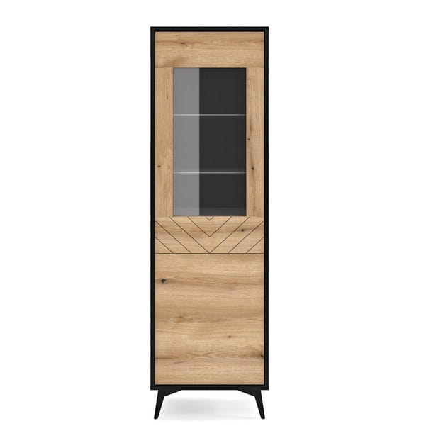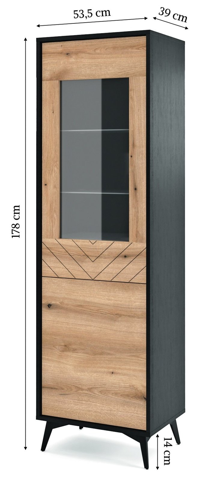 Ta loftowa witryna na wysokich nóżkach, z frontem ozdobionym dekorem w kształcie jodełki, stanie się centralnym punktem salonu lub sypialni.
