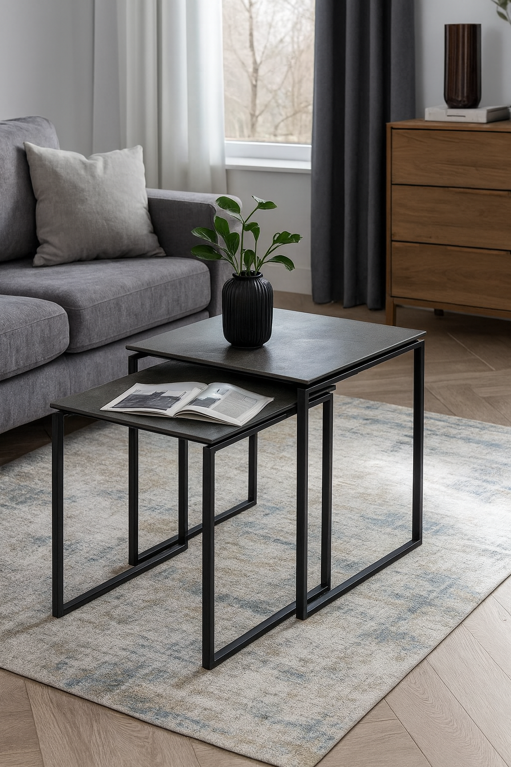 Zestaw stolików kawowych Katrine to wyjątkowe połączenie geometrii, kontrastu i nowoczesnych materiałów. Kwadratowe blaty wykonane z czarnej, szorstkiej ceramiki są odporne na ciepło i zarysowania, a przy tym łatwe do utrzymania w czystości.