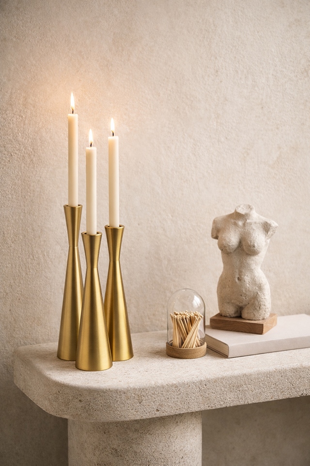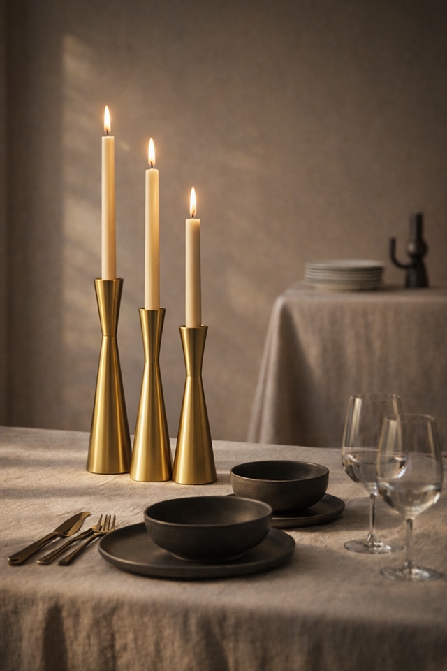 - Zestaw 3 świeczników – trzy różne wysokości pozwalają stworzyć spójną i efektowną dekorację