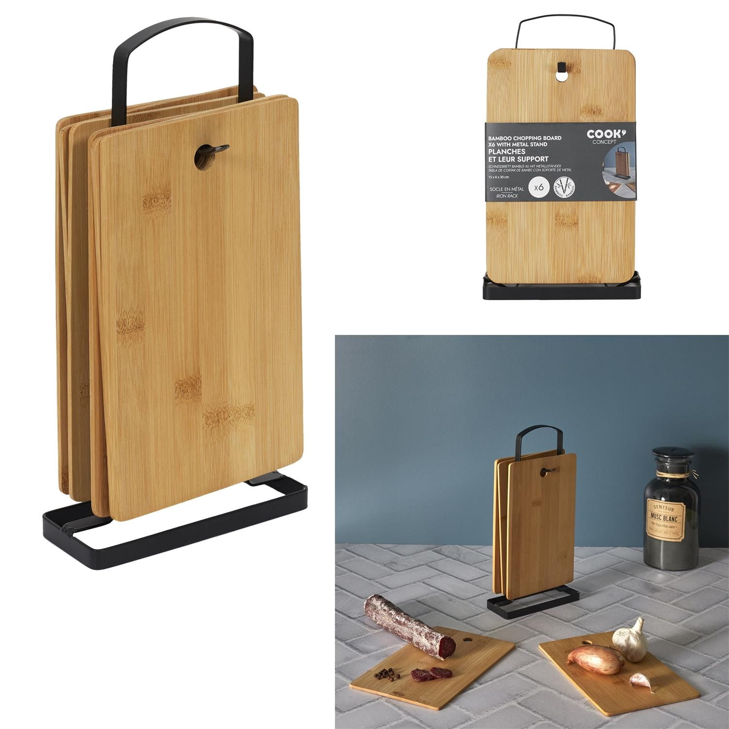 Zestaw 6 bambusowych desek do krojenia z metalowym stojakiem