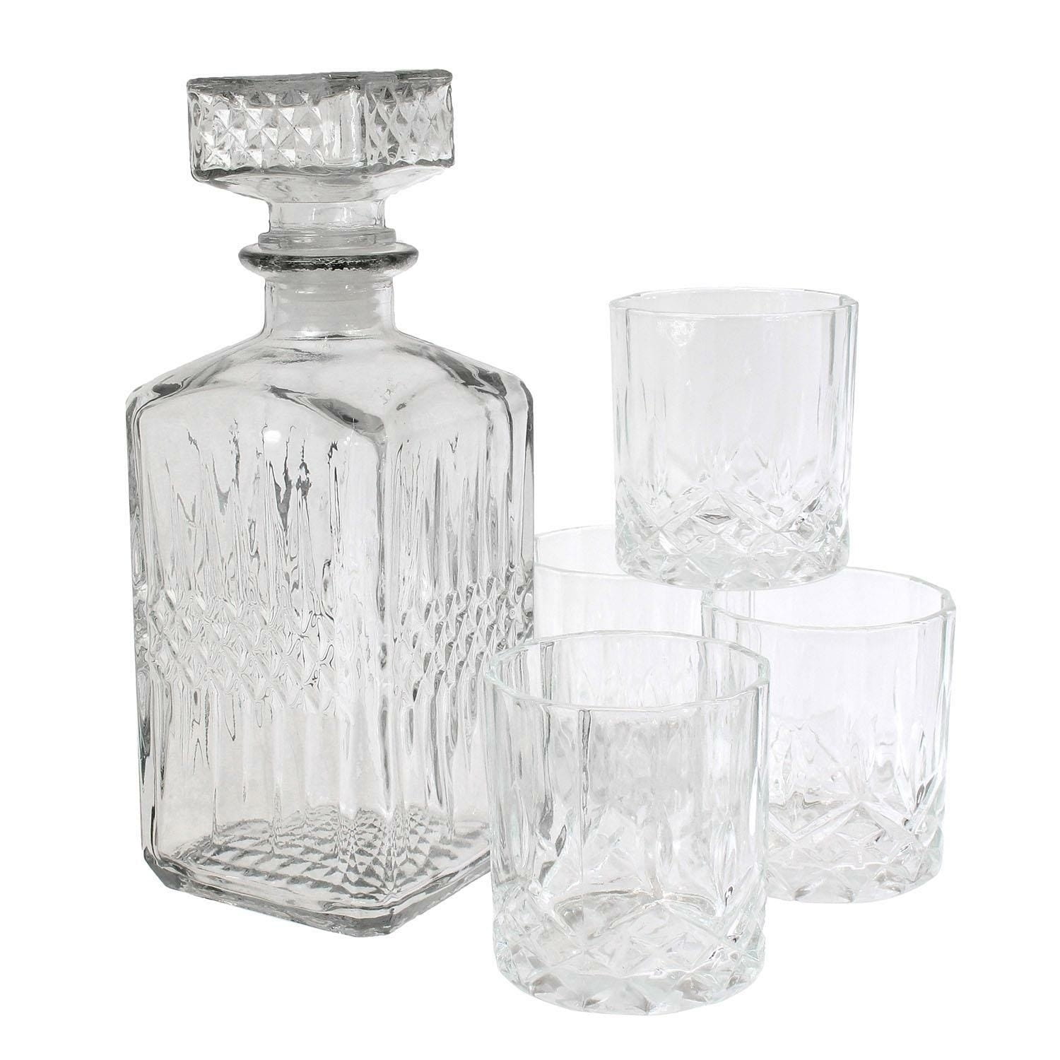 W jego skład wchodzą cztery stylowe szklanki oraz pojemna karafka wykonana z grubego szkła ozdobionego klasycznym, krzyżowym szlifem i pionowymi wyżłobieniami.