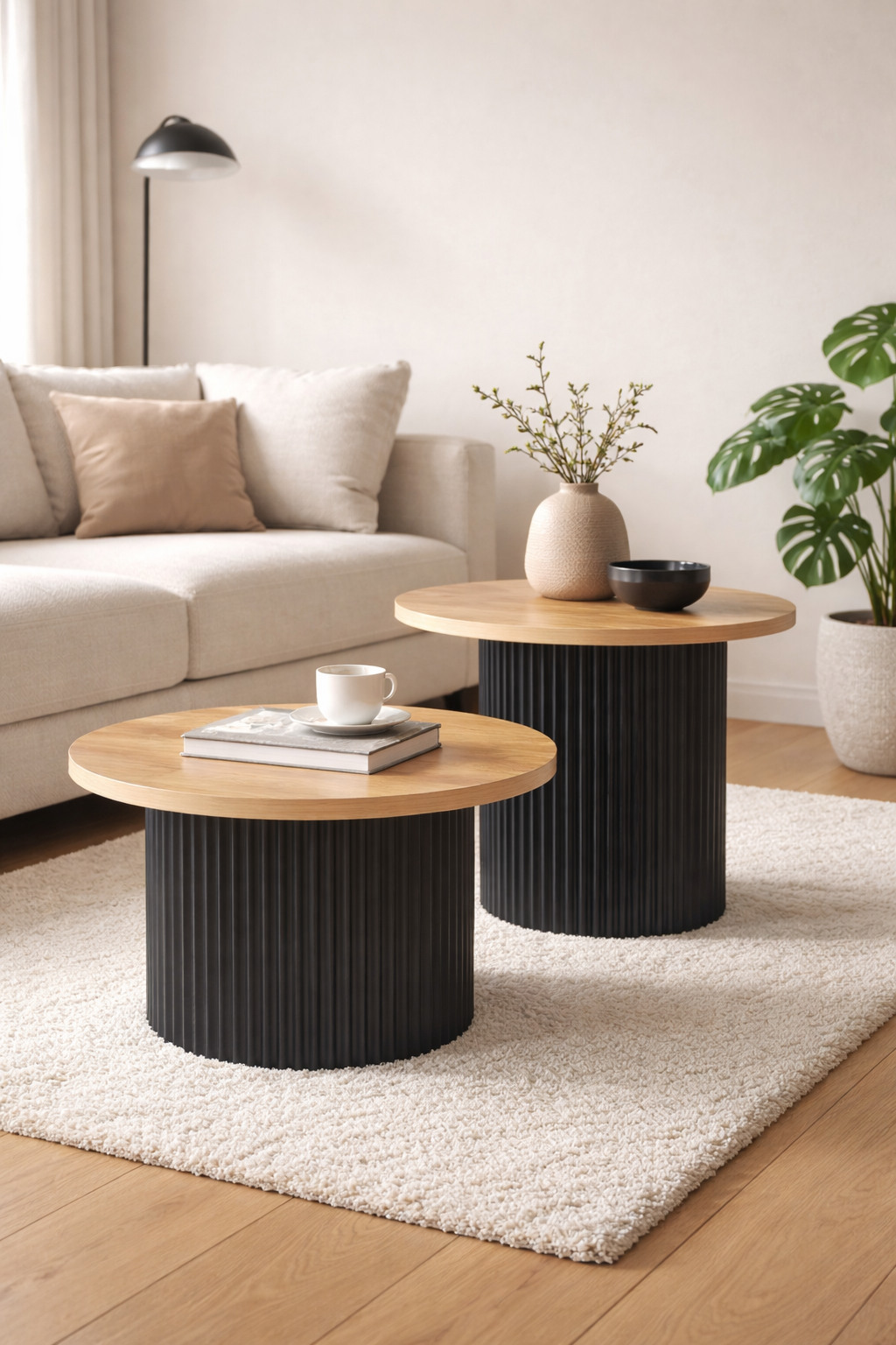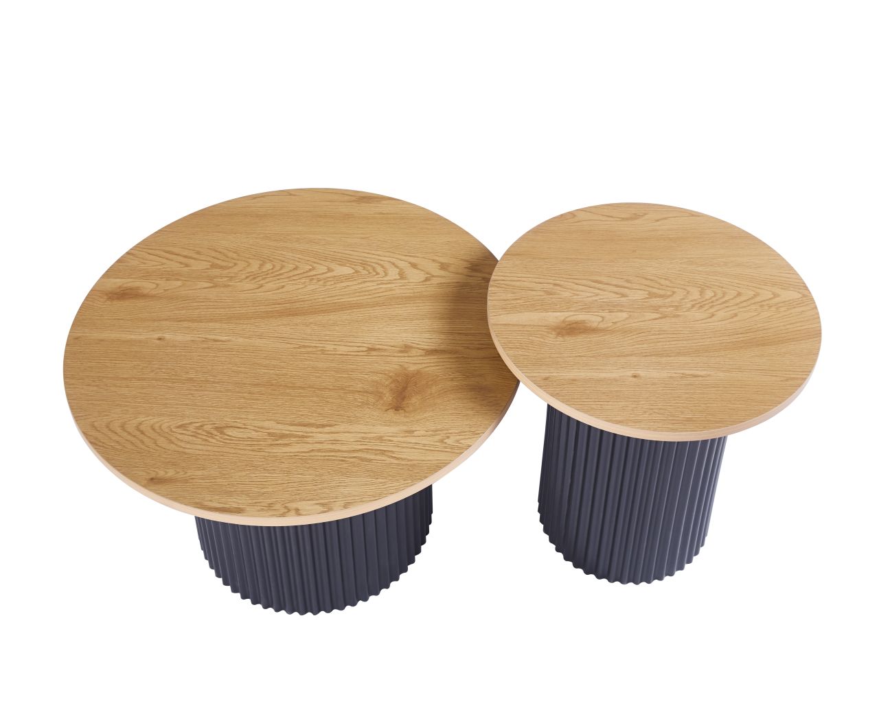 Dwa stoliki o różnych wymiarach można ustawić razem, tworząc spójną kompozycję, lub osobno – w zależności od potrzeb i wielkości wnętrza.