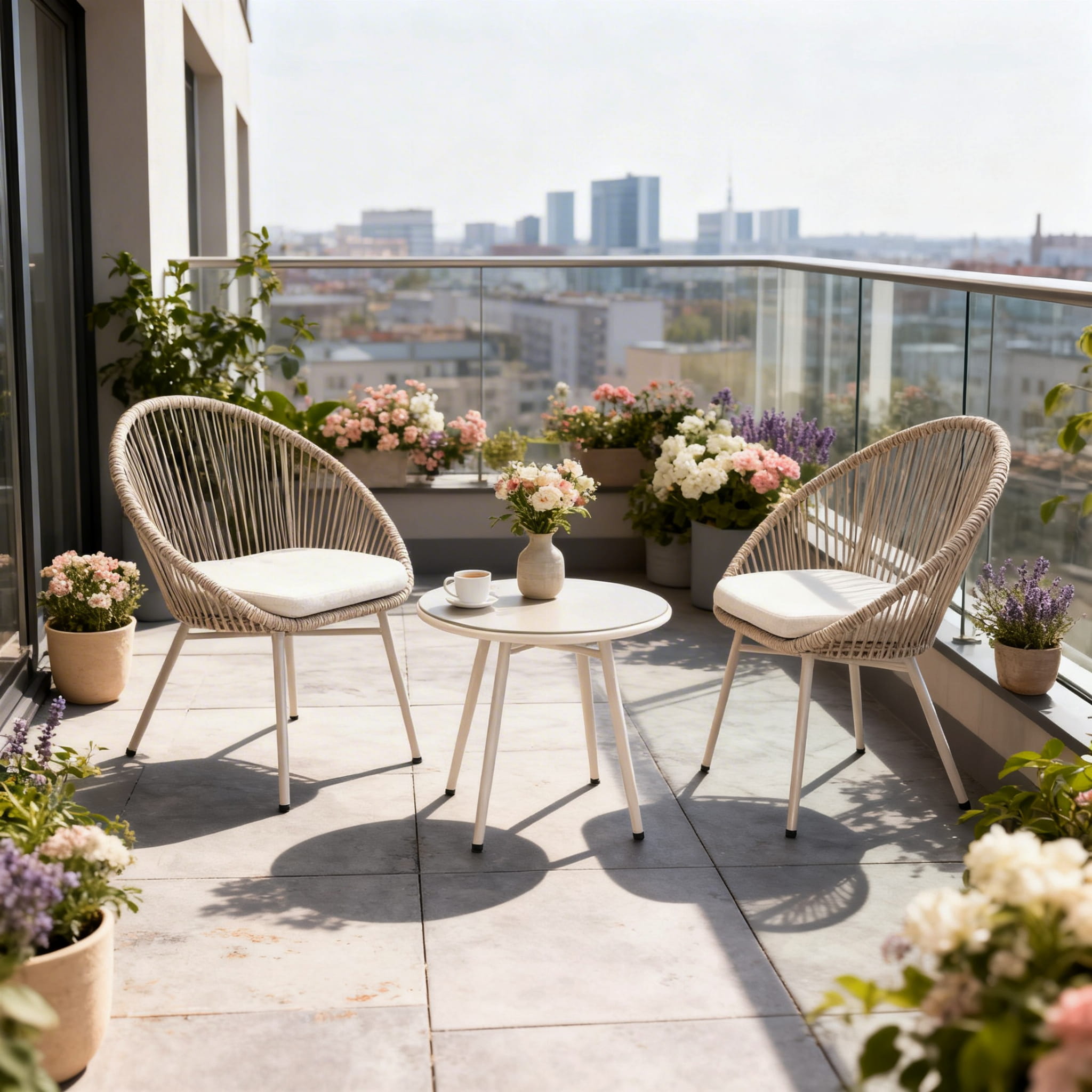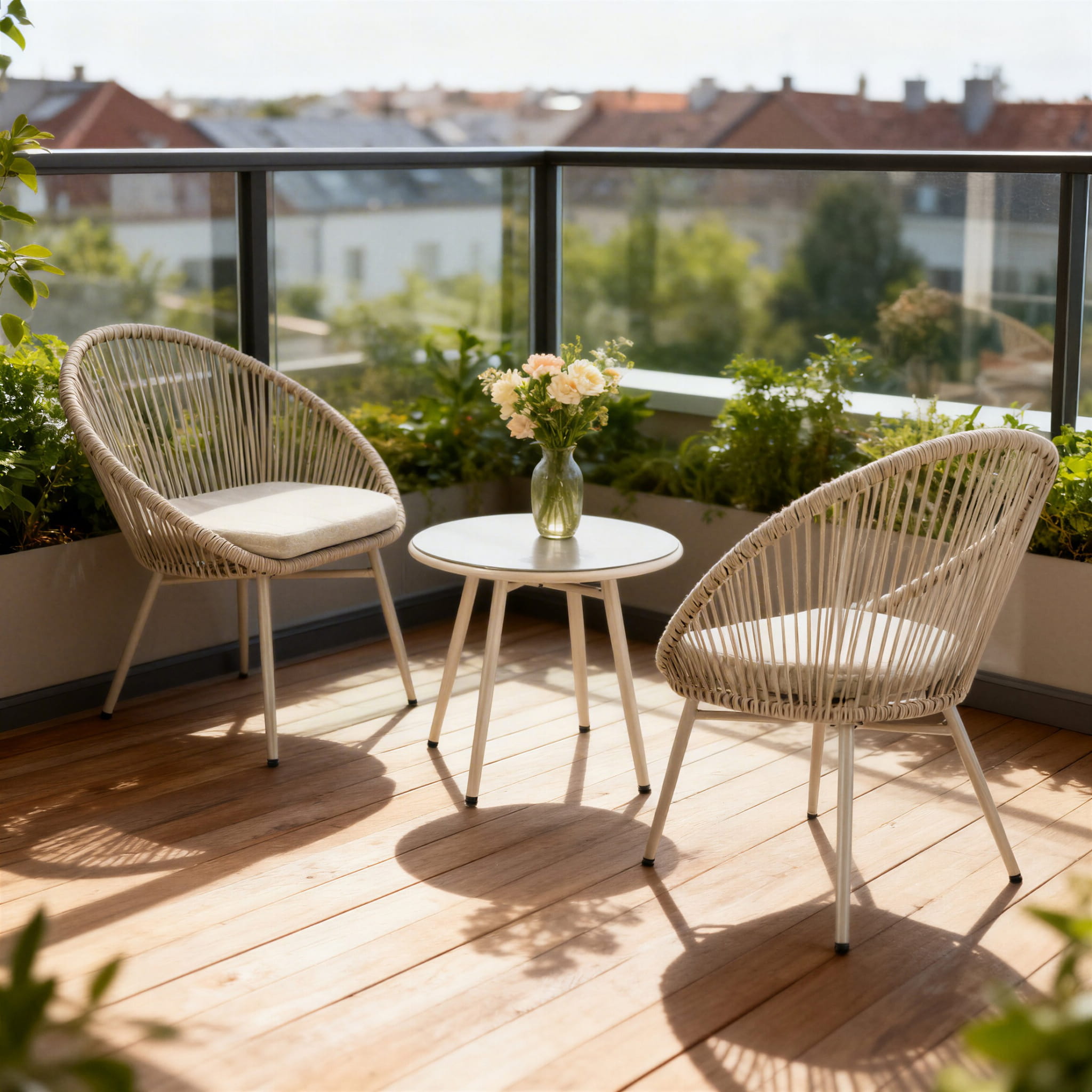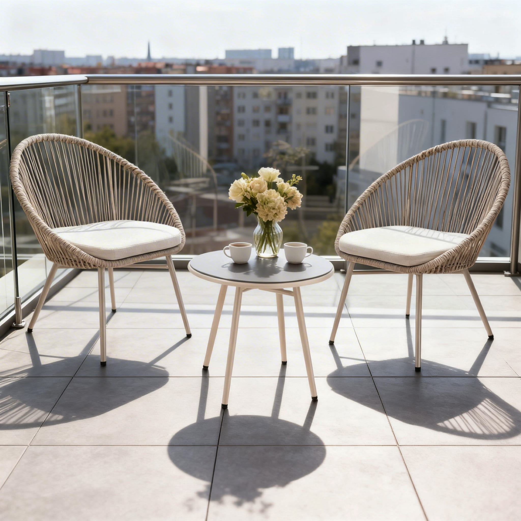 Dzięki kompaktowym wymiarom komplet świetnie sprawdzi się na balkonach w blokach, tworząc przytulną strefę wypoczynku nawet na małej przestrzeni. Nowoczesny wygląd i pleciony rattan doskonale pasują do aranżacji w stylu boho, skandynawskim, minimalistycznym i współczesnym.