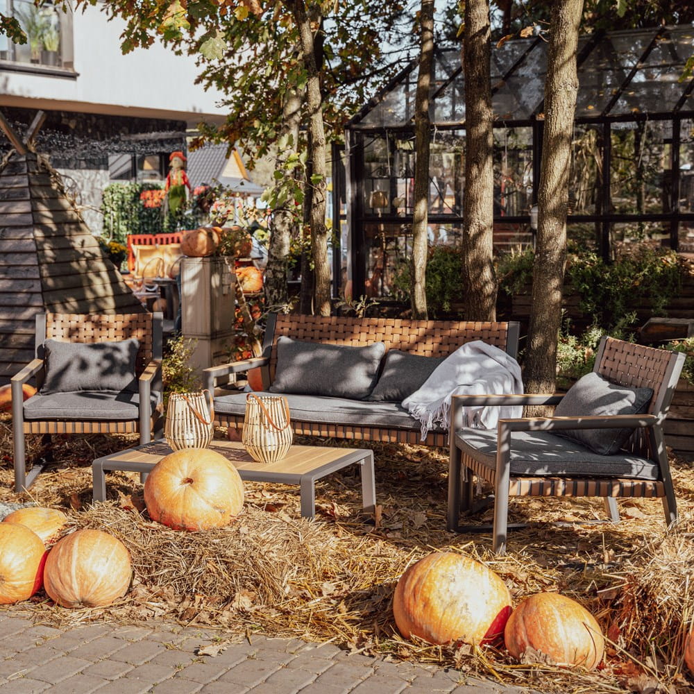 Stonowana kolorystyka sprawia, że komplet łatwo dopasujesz do roślin, płytek tarasowych i dodatków.