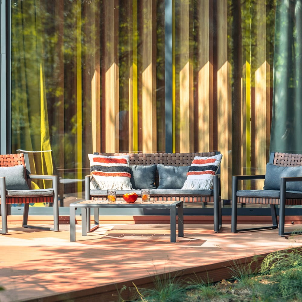 Blat stolika z poliwood daje efekt drewna bez konieczności konserwacji, a grube poduszki na siedziskach i oparciach zwiększają komfort wypoczynku.