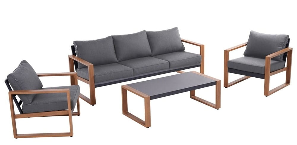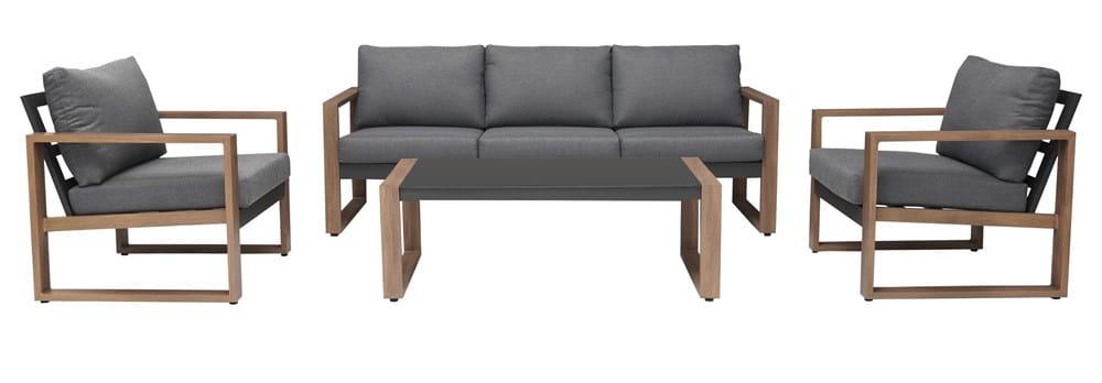 W komplecie znajduje się sofa, fotel oraz stolik, dzięki czemu łatwo zaaranżujesz taras, balkon lub ogród.