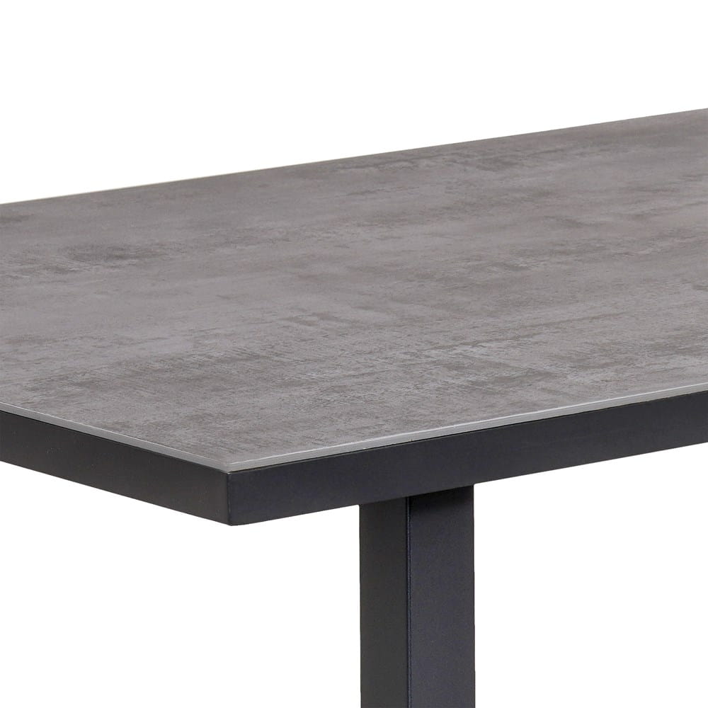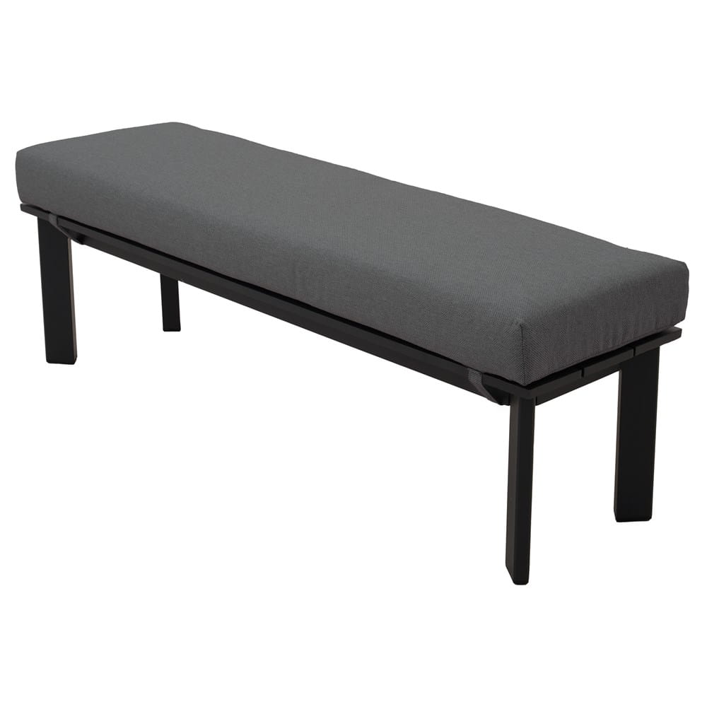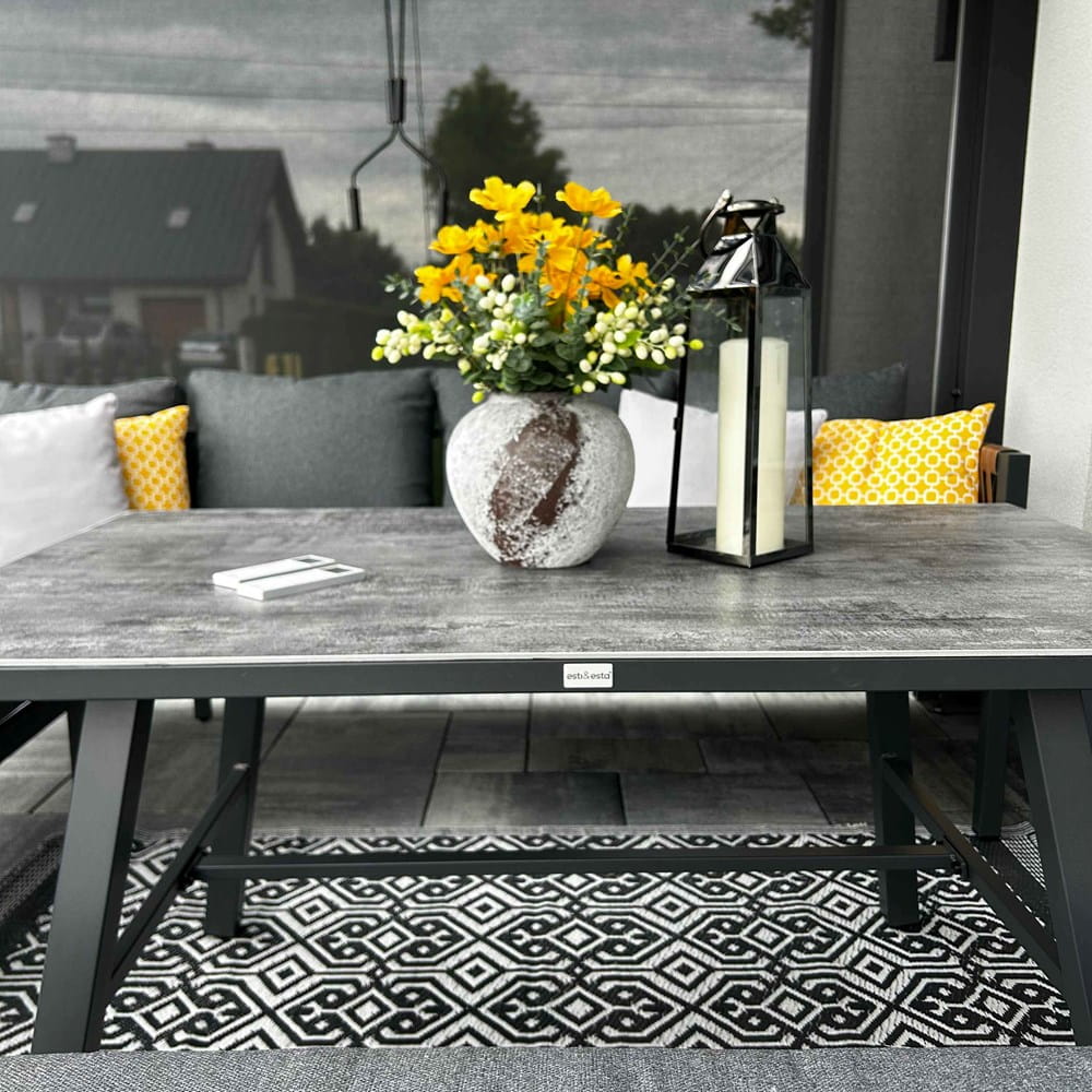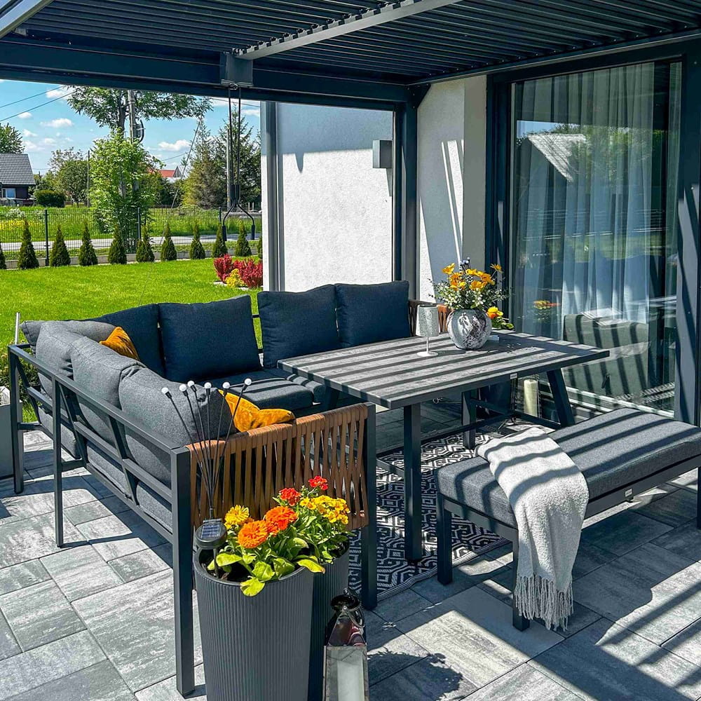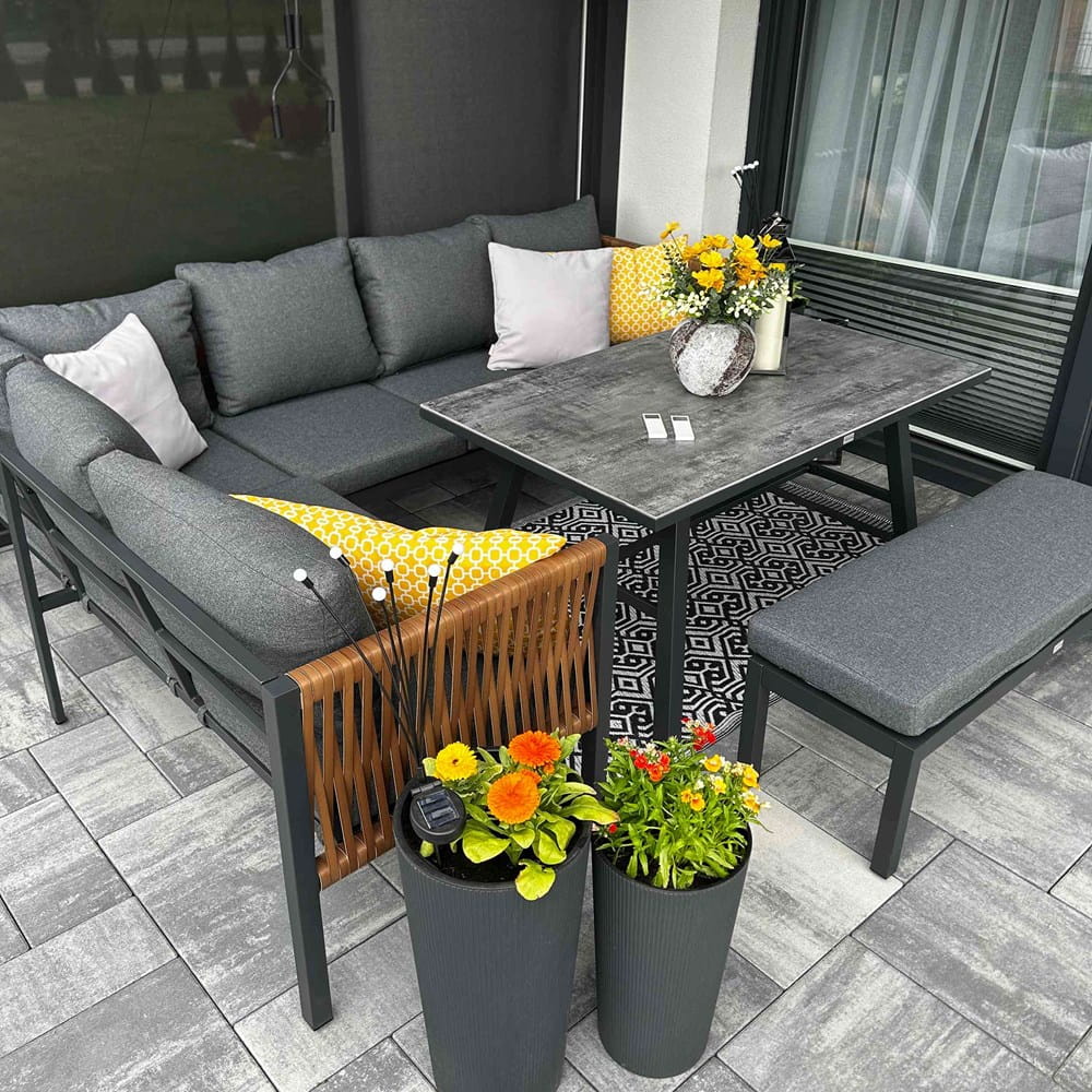 Duża narożna sofa, solidny stół z prostokątnym blatem w efekcie kamienia oraz wygodna ławka tworzą komplet idealny do altany, pergoli lub ogrodu.