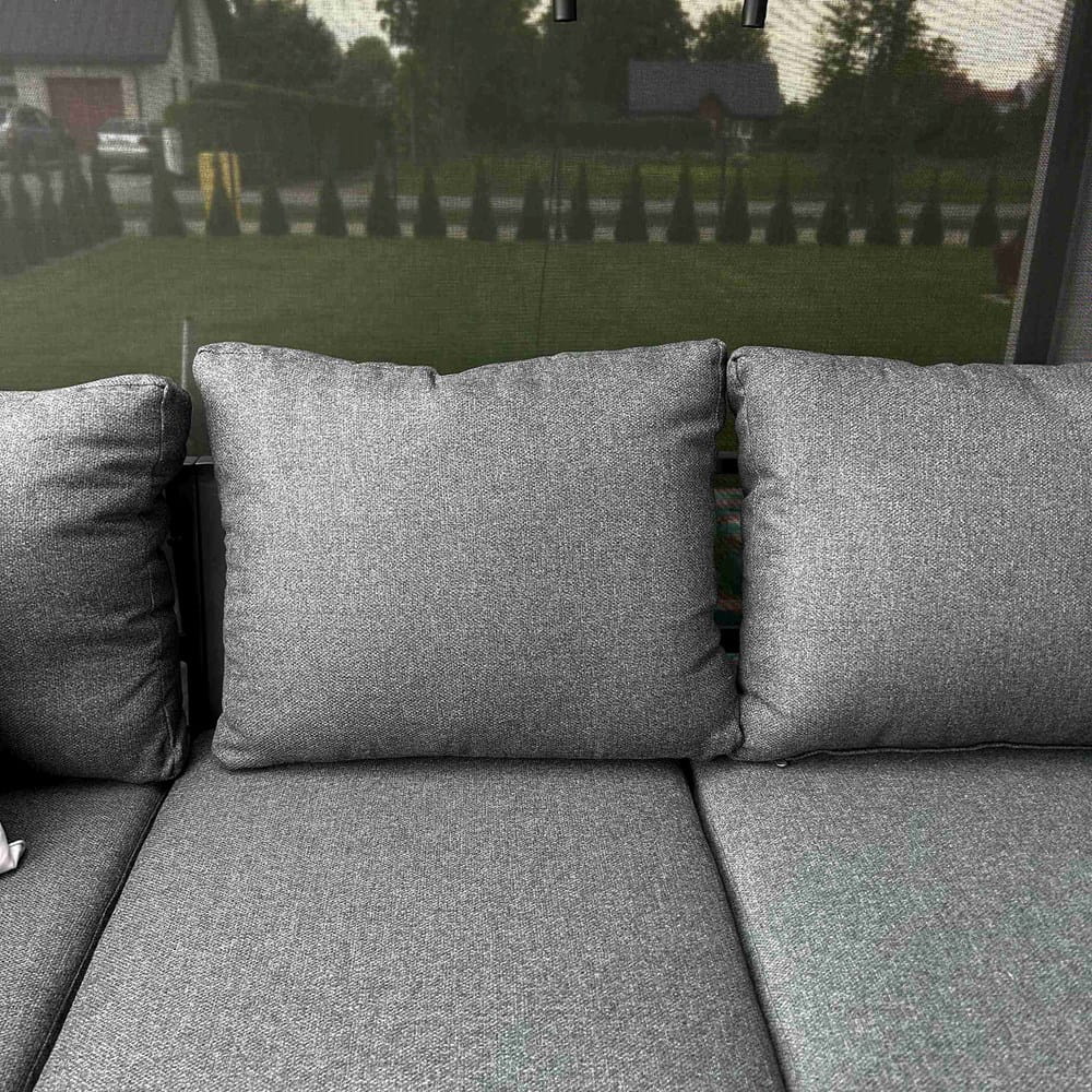 - Blat z efektem kamienia i poduszki – trwały, designerski blat oraz miękkie poduszki na siedziska i oparcia
