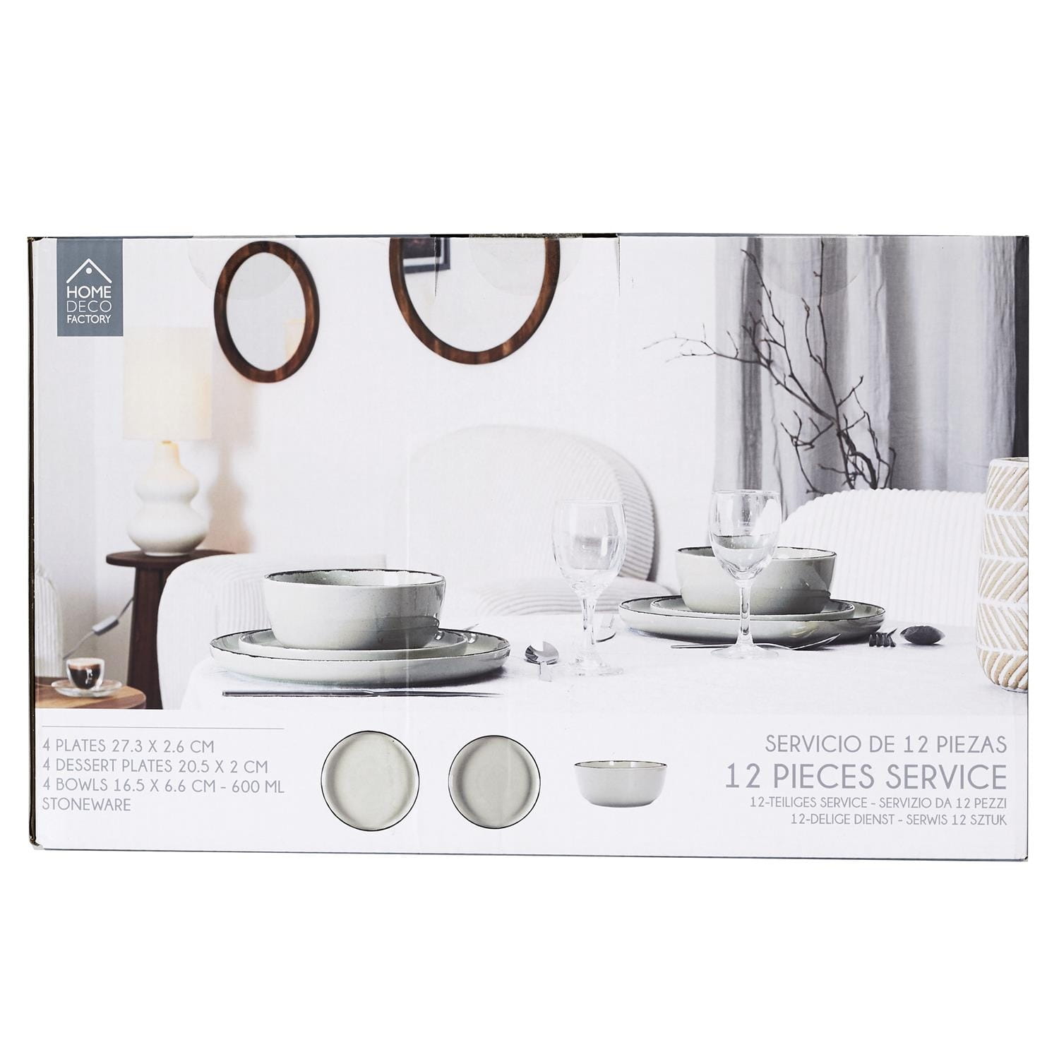 - Zestaw dla 4 osób: 4 miski (600 ml), 4 talerze deserowe (20,5 cm), 4 talerze obiadowe (27,3 cm)