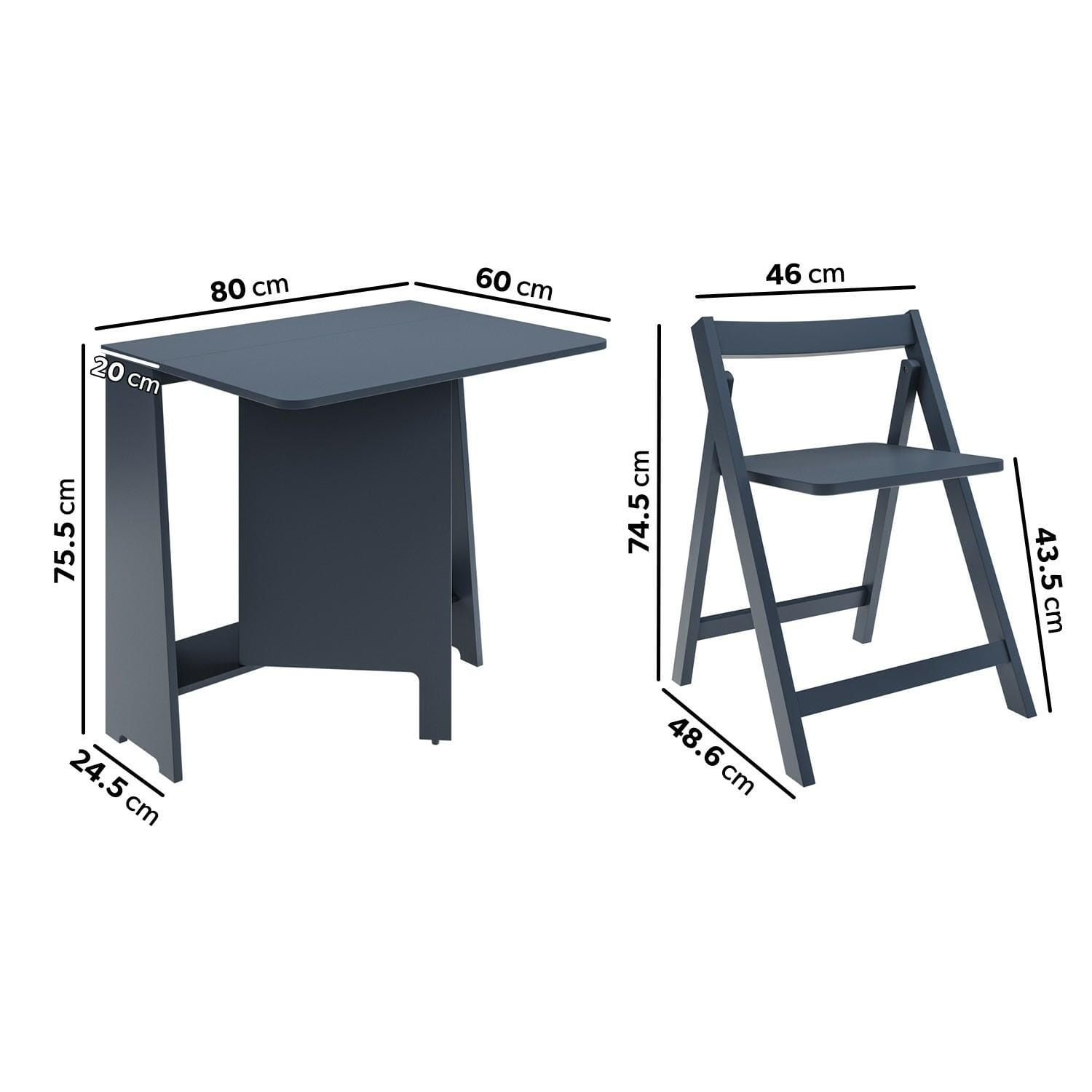 Składający się z małego stołu w kolorze granatowym i dwóch krzeseł, ten zestaw jest doskonałym wyborem dla małych przestrzeni, takich jak mieszkania czy kawalerki.